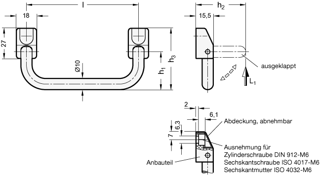 Der in der Tabelle angegebene Wert der statischen Belastbarkeit ist ein Richtwert, bei dessen Überschreitung es zur bleibenden Verformung bzw. zum Bruch des Kunststoffanbauteiles kommen kann. Gegebenenfalls ist der Klappgriff GN 425.2 zu verwenden.